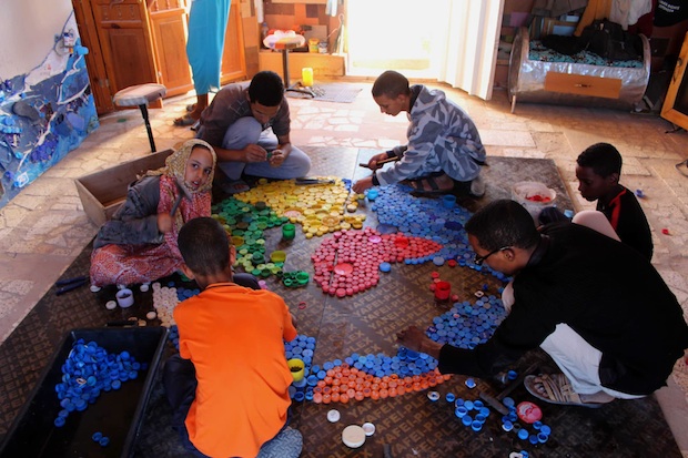 Brahim (coordinador del Bubisher de Smara) lleva varias semanas coordinándose con Mohamed Sulaiman y hoy, por fin, han realizado el proyecto conjunto: una charla de concienciación sobre la contaminación y el medio ambiente a un grupo de jóvenes asiduos a la biblioteca de Smara seguido de un taller de arte y reciclaje. La obra resultante junto a la pieza “The Great wave of plastic” será presentada el próximo sábado en el estudio MOTIF Art Studio del Mahbes (Smara) a las 15.00h.