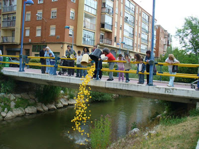 300 patitos amarillos surcando La Esgueva. Un montón de niños y personas adultas animando desde las orillas su marcha por el agua. Ni la lluvia pudo con la ilusión y las ganas.