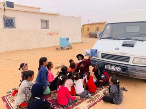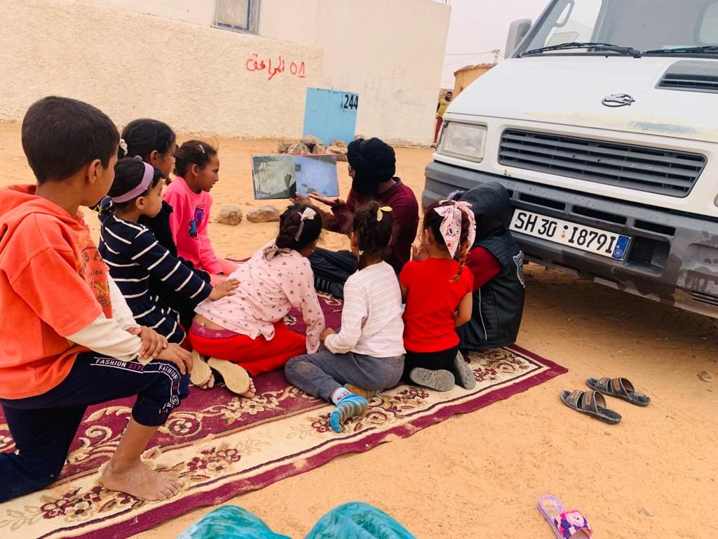 Y es precisamente eso, lo que nuestro bibliotecario Mohamed hace muchas tardes en la Hamada. Se convierte en un Aedo dispuesto a transmitir historias. El bastón del Aedo es sustituido por un libro y su público son los niños y niñas saharauis montados en una “Alfombra mágica” dispuestos a volar a lo largo y ancho de este mundo de de miles de mundos.