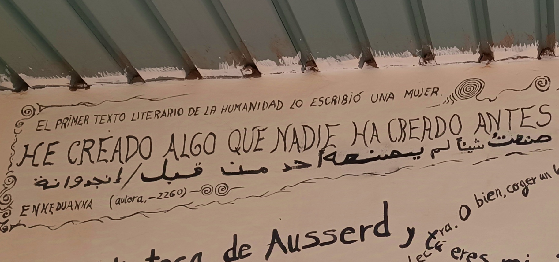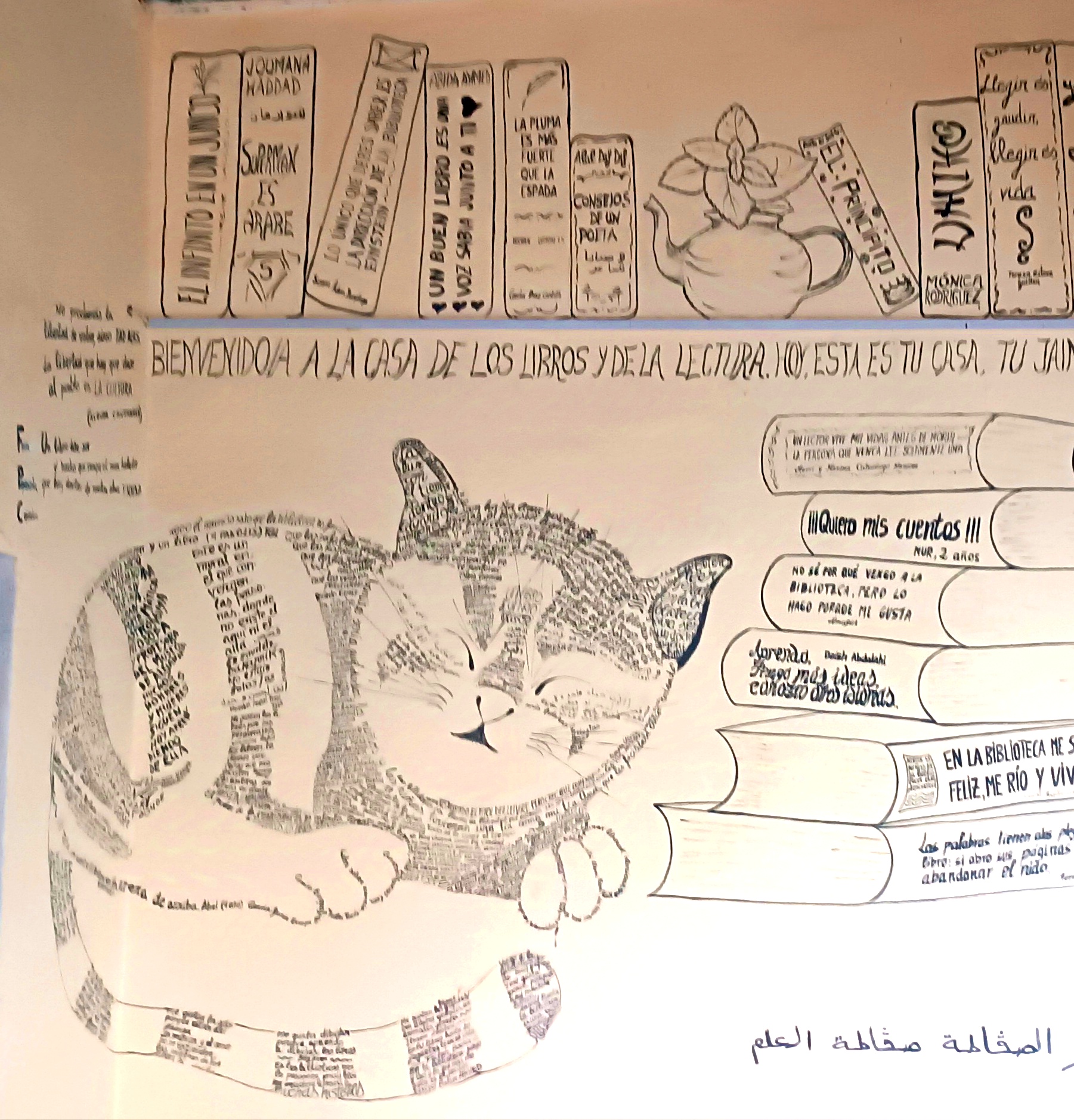 El mural será la portada del cuento del pacífico gato de Aussserd que custodia libros y atrae palabras de cualquier tiempo y de cualquier lugar para que se queden cerquita de él  y se vayan colocando según les dé, como cintas al viento, atravesando la pared, descansando en los lomos de los libros o apelotonadas en  mensajes que él mismo se encargará de esconder en su pelaje; mensajes, unos de letras grandes porque hay que tapar pared, otros de letras pequeñas y muy pegaditas porque es un gato atigrado con las orejas centinelas; y que como siguen faltando palabras busca a Hipatia en la sala de lectura y se la tatúa en su cuerpo, y pide a los niños y niñas de Ausserd mas frases para  adornar su cola y a las bibliotecarias también para rellenar lomos vacíos; y deja que  Enheduana se escape del libro de Irene Vallejo allá arriba a la izquierda para transitar sin perder altura  hasta  la pared de la derecha y quedarse allá como le corresponde, erigida en lo alto, sacerdotisa de las letras que ahora cuidará también del gato que custodia los  libros de Ausserd.